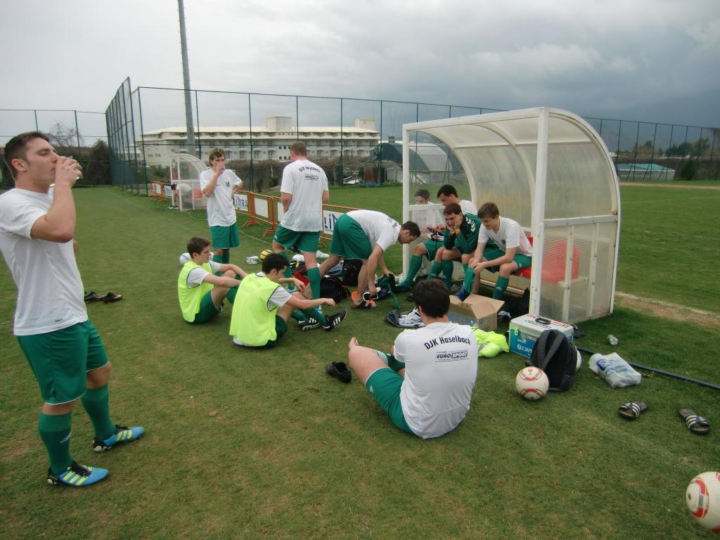 Nach 3 Jahren Abstinenz hieß es 2012 endlich wieder Trainingslager für die Kicker und Verantwortlichen der DJK Haselbach. Die fast schon traditionelle Veranstaltung wurde von 21 aktiven Spielern der Ersten und Zweiten Mannschaft sowie unserem Kassier Dichtl Michael und Nagler Günter angenommen. Unseren Abteilungsleiter Krompaß Stefan mussten wir wegen seiner Flugangst leider zu Hause lassen. Nach knapp zweistündiger Busfahrt mit Knacker und Bier setzte man am Flughafen München am Nachmittag zum Abflug mit Sun Express an. Spät am Abend erreichte man endlich auch das große Hotel Limak Limra, wo die Zimmer für die Pärchen bereit waren. Gegen Mitternacht gab es für alle noch ein üppiges J Mahl bevor man zur Nachtruhe überging. Der nächste morgen begann erstmals mit einer halbstündigen Laufeinheit, die bis auf Ausnahme des letzten Tages zum Pflichtprogramm gehörte. Anschließend war man dann im Gewühl des Frühstücksbuffets zwischen russischen, österreichischen und Schweizer Fußballern und türkischen Ringern auf sich allein gestellt. Um 10:00 Uhr stand die tägliche Trainingseinheit an, zur Verwunderung schaffte man es fast immer pünktlich und einheitlich, den nahegelegen Trainingsplatz zu betreten, ehe es mittags wieder um den Essenskampf ging. Grund dafür dürfte die Einführung eines neuen Strafen-Kataloges gewesen sein, wonach nicht nur die übliche kleine Geldstrafe für die Mannschaftskasse, sondern auch eine Zusatzleistung wie ein Getränkebringdienst für alle am selben Tag inklusive war. Leider wurde bereits die erste Trainingseinheit durch eine gravierende Verletzung von Keeper Dutschke Manuel getrübt, der mit dem kleine Finger im Rasen hängen blieb, sich diesen auskugelte und sofort in einem Krankenhaus gegen 500 € und 2 Spritzen behandelt wurde. Die Nachmittage standen überwiegend zur freien Verfügung. In der Hotelanlage stand ein Fitnessraum, Hallenbad mit Sauna Hamam sowie ein Massagezentrum zur Verfügung. Desweiteren konnte man sich mit Minigolf, Kartenspielen und in der kleinen Zockerbude bei Basketballwürfen und Ballerspielen bei Laune halten. Leider spielte das Wetter in der Woche nicht so recht mit und es war abwechseln bewölkt, regnerisch und windig. Ab und an konnte man für kurze Zeit auch die Sonne genießen. Bei einem Ausflug ins nahe gelegen Kemer stand das traditionelle Shopping von Trikots und diverser andere Dinge ebenso auf dem Plan, wo unsere türkisch-österreichischer Freund Kasim begleitete und mit Rat und Tat beiseite Stand. Ein Highlight der Türkischen Woche war die Champions-League Partie der Bayern gegen Basel, für die uns eine Leinwand in der kleine Kinoanlage des Hotels zur Verfügung stand. Mit großer Begeisterung feierte man anfangs zusammen mit der Schweizer Fußballkollegen, die sich aber in der Überzahl schon beim 4:0 Pausenstand verabschiedet hatten J. Der kleine Rest wurde dann in der zweiten Halbzeit vom Stadionsprecher Braml Markus bei jedem weiterem Tor bis zum 7:0 Endstand aus dem Saal gebrüllt. Der Geburtstag von Rauch Raphael stand ebenfalls in der Woche an, welcher gebührend in der Hausdisko und anschließend auf den Hotelzimmern und Fluren gefeiert wurde, bis letztendlicher das Geburtstagskind gegen 3:00 Uhr in seinem Bett mit den Worten “Eine deutsche Eiche fällt nicht um „ abgelegt wurde. Auch bei unseren beiden Nichtspielern fand die Getränkeauswahl im Hotel anscheinend auf Zuspruch, was an einem Abend eine zweistündige Odyssee von der Hausdisco im Erdgeschoss bis in die Zimmer im 4. Stock zur Folge hatte. Angemerkt sei, dass der Aufzug zu dieser Zeit natürlich in Betrieb war. Nach dieser ereignisreichen Woche, die wie im Fluge verging, kam die Abreise am Samstagvormittag, die leider am Flughafen mit einer zweistündigen Verspätung und dem Heimflug nach München und der Busfahrt nach Haselbach endete, wo gegen Abend die wartenden Freundinnen und Familien bereits zum Empfang bereitstanden.